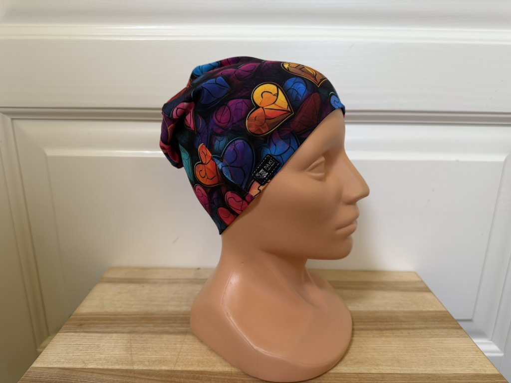 Barevná, hravá a plná života. Tato čepice s motivem srdíček ve stylu vitráže nebo malovaných kamínků přináší optimismus i do těch nejšedších dnů.