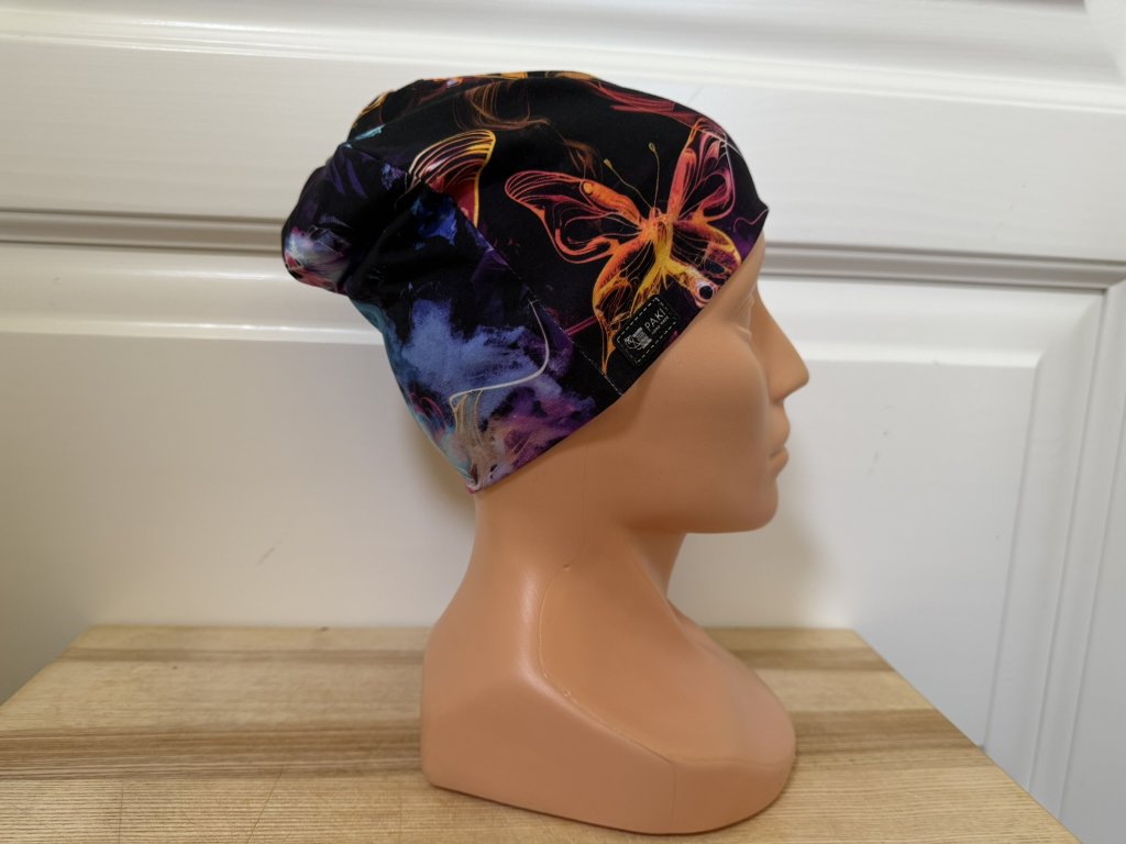 Originální čepice s magickým motivem motýlů v kouřových barvách. Elegantní černý podklad a syté tóny oranžové, fialové a růžové dělají z téhle čepice nepřehlédnutelný doplněk.
