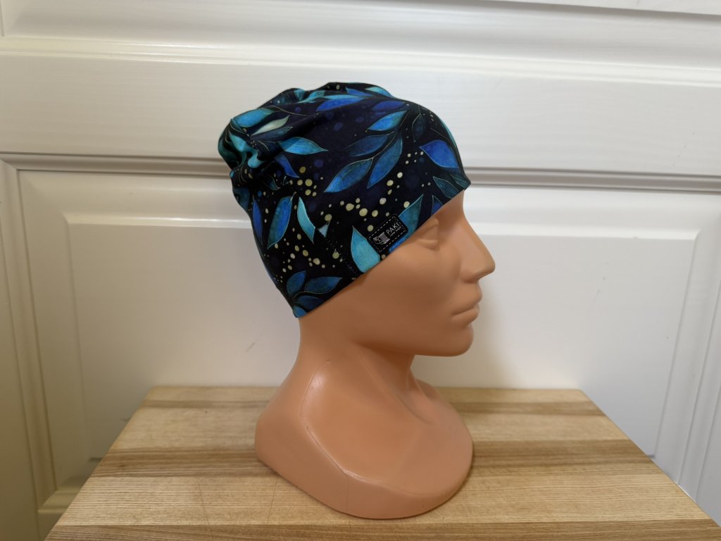 Tmavý podklad a jemný listový motiv v modrých tónech. Tahle čepice působí klidně, přirozeně a zároveň stylově. Hodí se pro každého, kdo má rád přírodu, jednoduchost a originální doplňky.