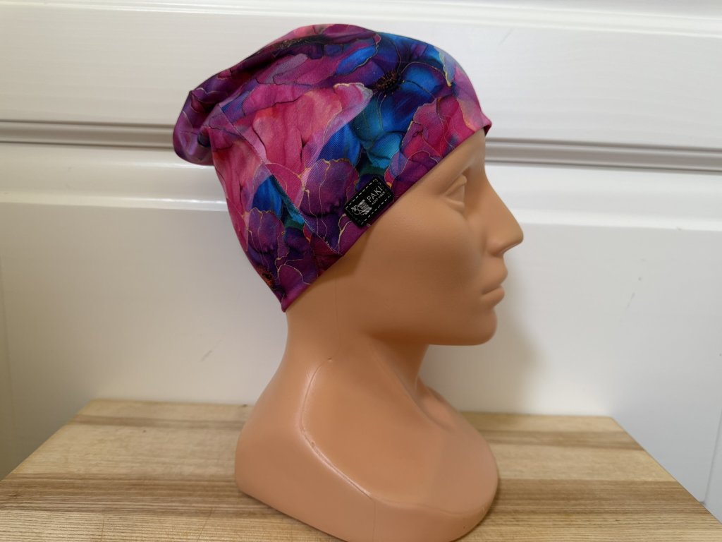 Syté tóny růžové, fialové a modré vytvářejí dojem rozkvetlé zahrady. Tato čepice je jako jarní květina – zářivá, ženská a nepřehlédnutelná.