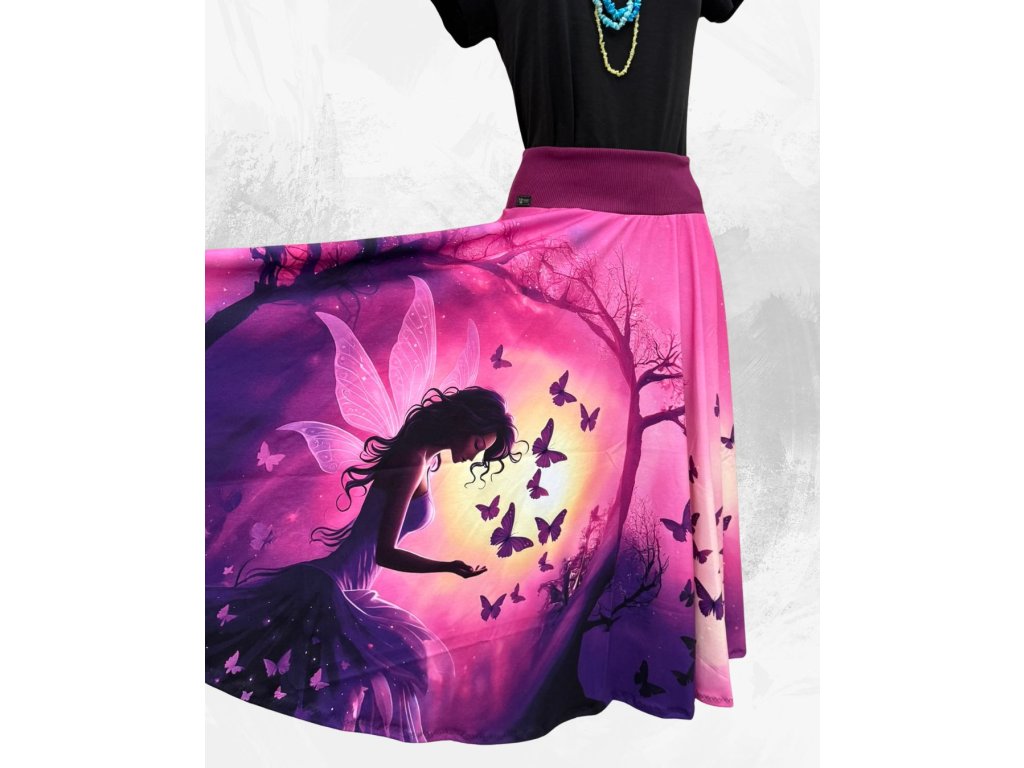 Okouzlující kolová sukně, která vás přenese do pohádkového světa. Zářivý růžovo-fialový podklad zdobí silueta víly obklopené poletujícími motýly a magickým světlem zapadajícího slunce. Tento výrazný design působí romanticky, tajemně a dodá vašemu outfitu jedinečný kouzelný nádech.