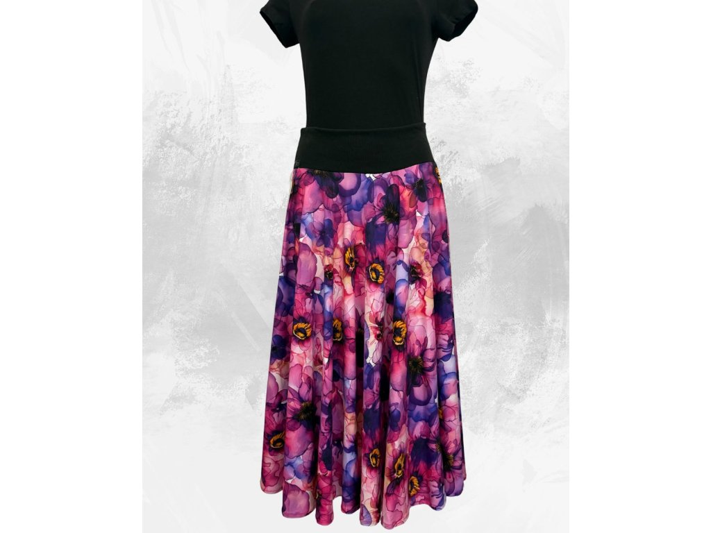Dámská dlouhá kolová úpletová sukně,fialové pavučinkové květy, vel S,M
