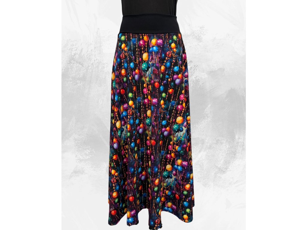 Originální půlkolová sukně, která rozjasní každý den! Barevný vzor korálků na tmavém podkladu působí hravě, veselě a přitom elegantně. Díky pružnému černému nápletu v pase se skvěle přizpůsobí postavě a pohodlně se nosí po celý den.