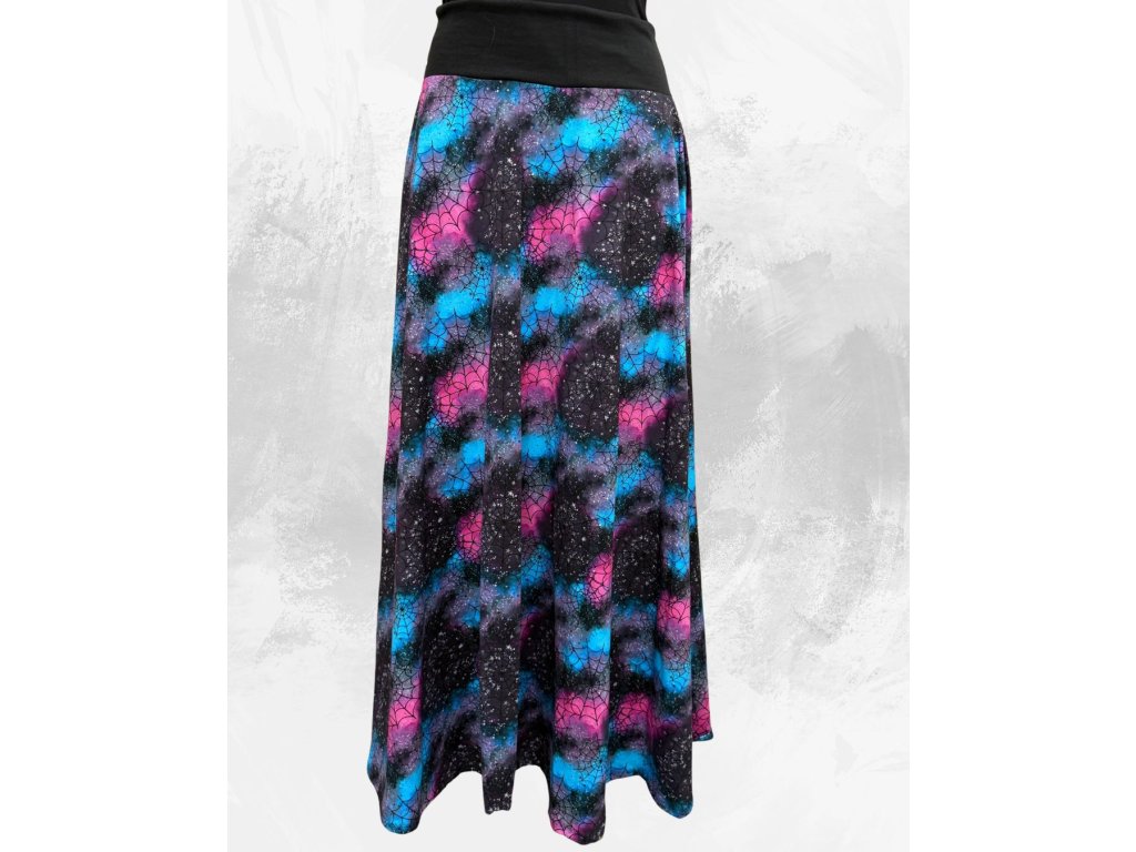 Originální půlkolová sukně, která zaujme na první pohled svým netradičním designem. Barevná kombinace růžové, tyrkysové a černé vytváří efekt tajemného vesmíru, v němž se prolínají jemné linie připomínající pavoučí síť.