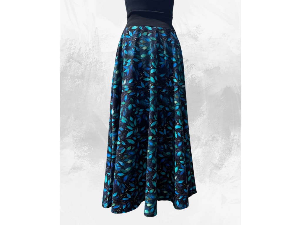Dámská dlouhá na zem půlkolová úpletová sukně, krásné modrolístky, vel S,M