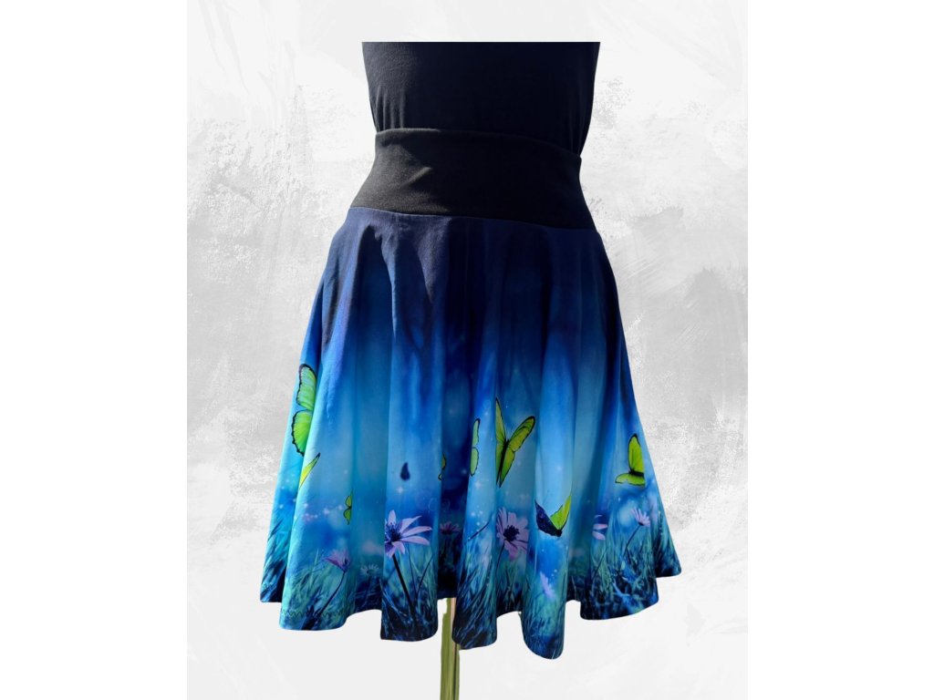 Dámská krátká kolová úpletová sukně, motýlci na modré