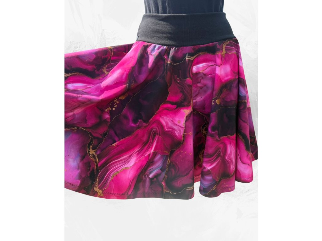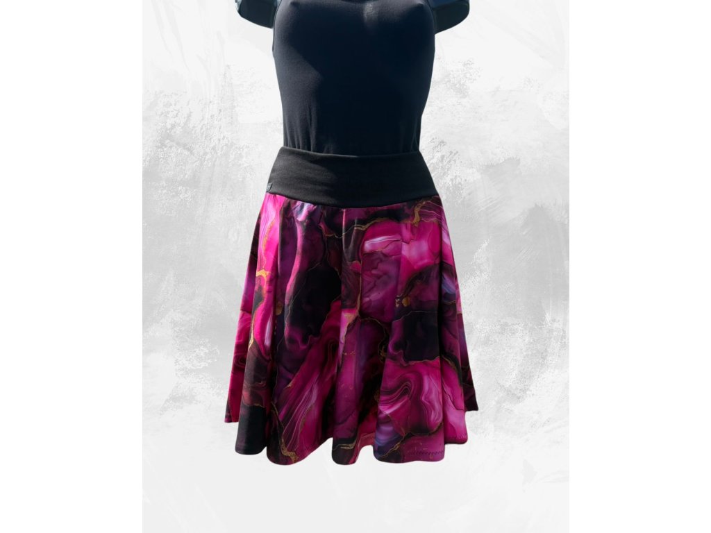 Elegantní kolová sukně z jemného úpletu s originálním mramorovým vzorem v odstínech vínové, růžové a černé. Zlato ve vzoru vytváří dojem luxusu a jedinečnosti.