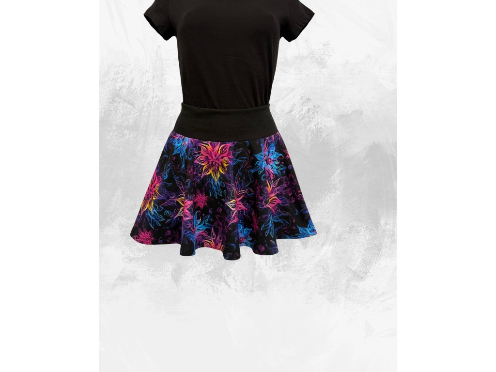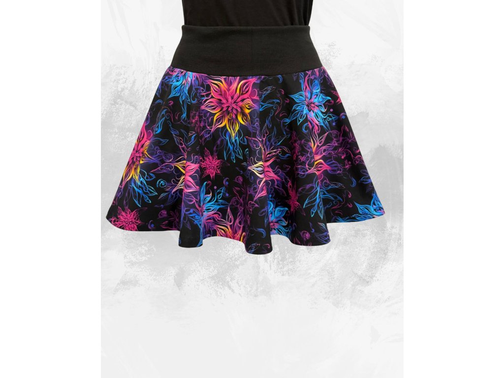 Výrazná kolová sukně z jemného úpletu s motivem zářivých květů připomínajících medůzy. Syté barvy na černém podkladu dodávají sukni energii a hloubku.