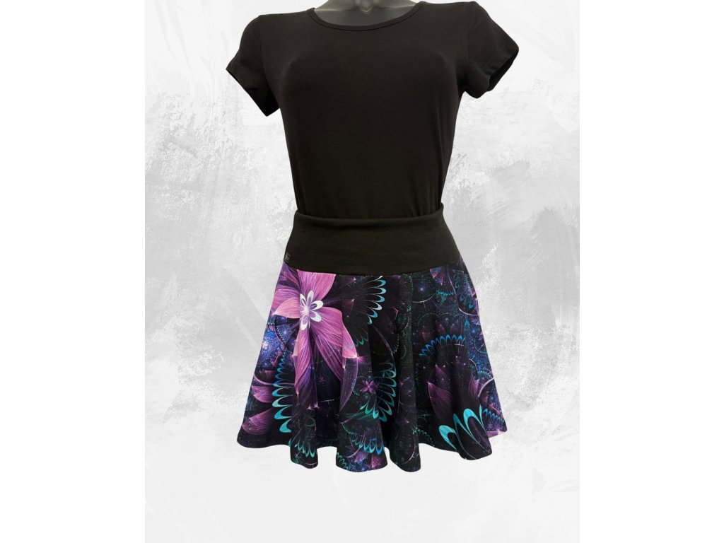 Originální kolová sukně s fascinujícím mandalovým vzorem, který září odstíny fialové, tyrkysové a černé. Každý pohyb v ní vynikne – látka se krásně točí a vytváří dojem lehkosti a ženskosti.