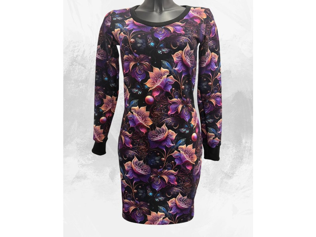 Originální šaty z teplákoviny, s dlouhým rukávem, ve kterých vyniknete. Motiv jsou fialkové květy