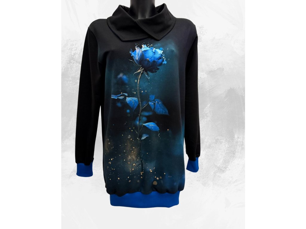 Dámské mikino-šaty s kříženým límcem, modrá růže na černé