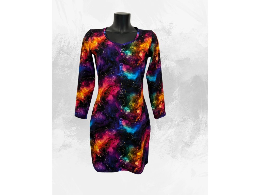 Originální úpletové šaty s dlouhým rukávem, které září jako vesmír plný barev. Fialové, modré, zlaté a oranžové tóny se prolínají v abstraktním galaktickém vzoru a vytvářejí efekt zářivé mlhoviny.