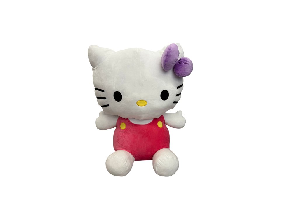 Roztomilá plyšová kočička Hello Kitty v nadstandardní velikosti 81 cm potěší všechny malé i velké fanoušky této oblíbené postavičky. Oblečená je do růžových kalhotek se žlutými knoflíky a zdobí ji fialová mašle na oušku. Vyrobena z měkkého, hebkého materiálu je ideální na mazlení i jako dekorace do dětského pokoje.