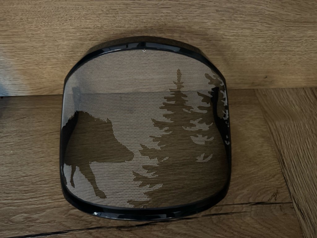 Ochranný obličejový štít z nerezové oceli pro ochranu hlavy Protos Integral® Forest s hustotou 39 otvorů/ cm2 skvěle propouští světlo. Patentovaná pryžová guma odolává námraze, zabraňuje průniku deště a prachu z horní části a odvádí je na pravou či levou stranu. Snadná montáž i demontáž. Obrázek divočák.