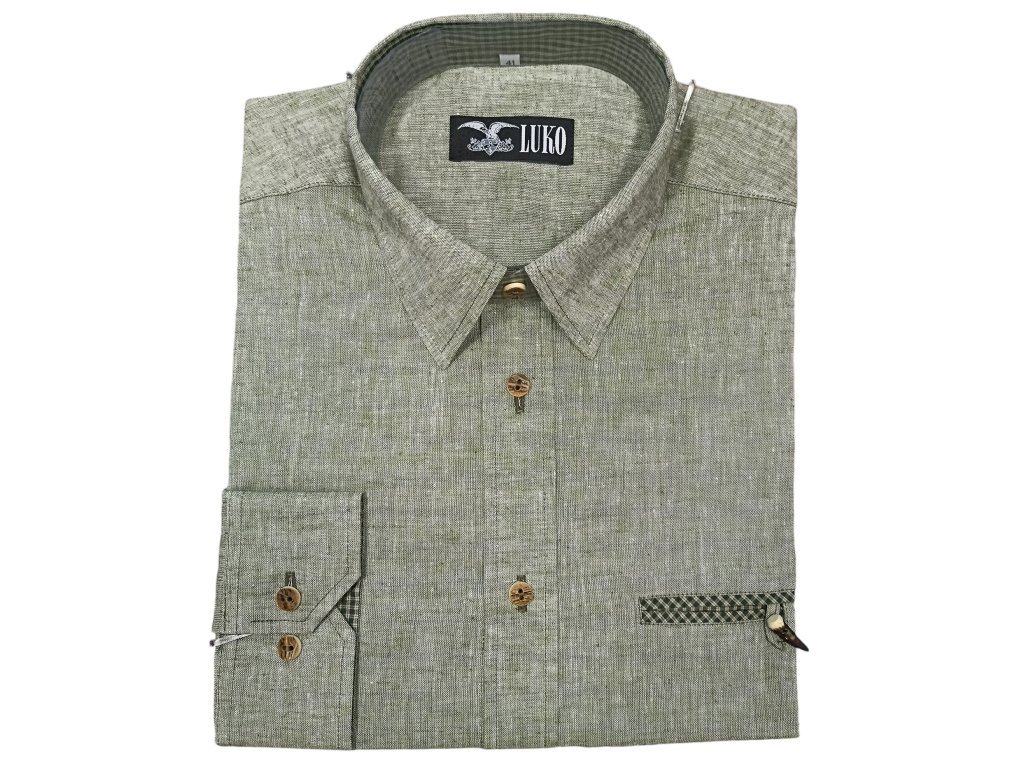 Pánská košile s dlouhým rukávem ze směsového materiálu 80% bavlna/ 20% len. Materiál je v provedení šedozelený drobný vzor s kombinací na límci, manžetě a kapsičce.