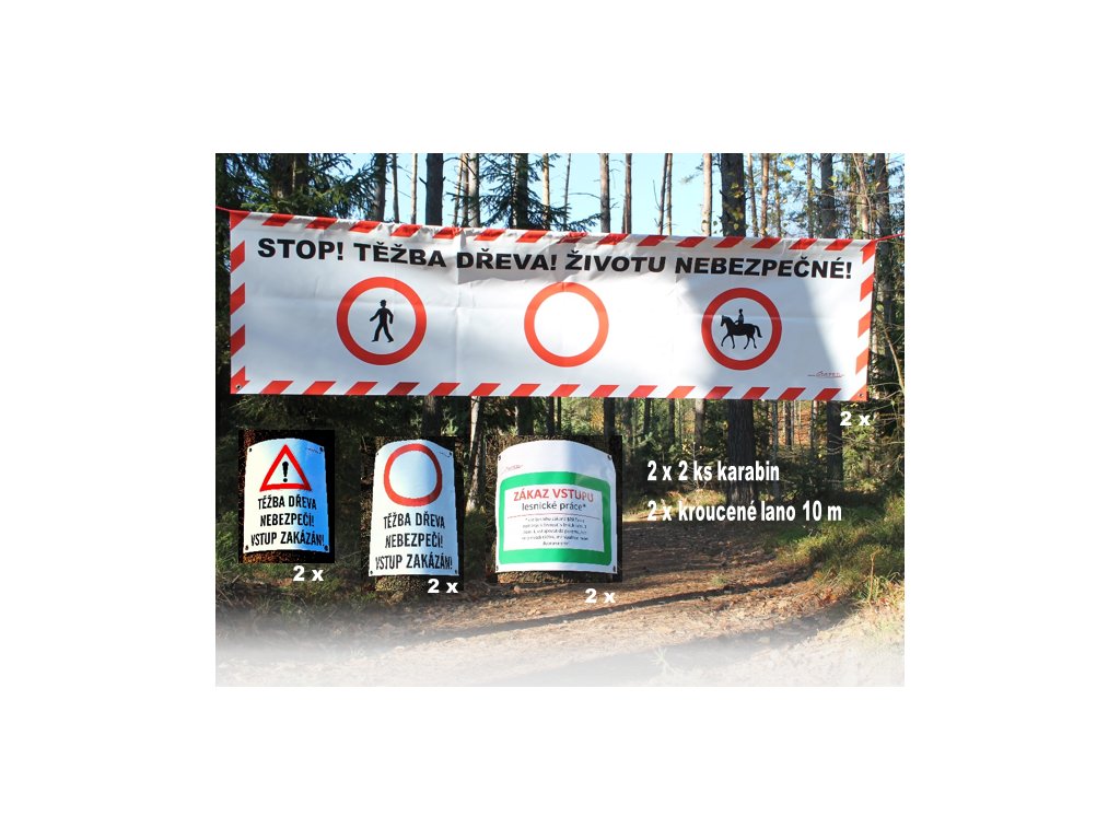 Kompletní sada bannerů a výstražných značek určená k označení prostoru při práci lesní techniky. Praktické řešení pro těžbu dřeva, přibližování i další lesnické činnosti, kde je nutné zajistit viditelné a srozumitelné upozornění na probíhající práce a zvýšené nebezpečí.