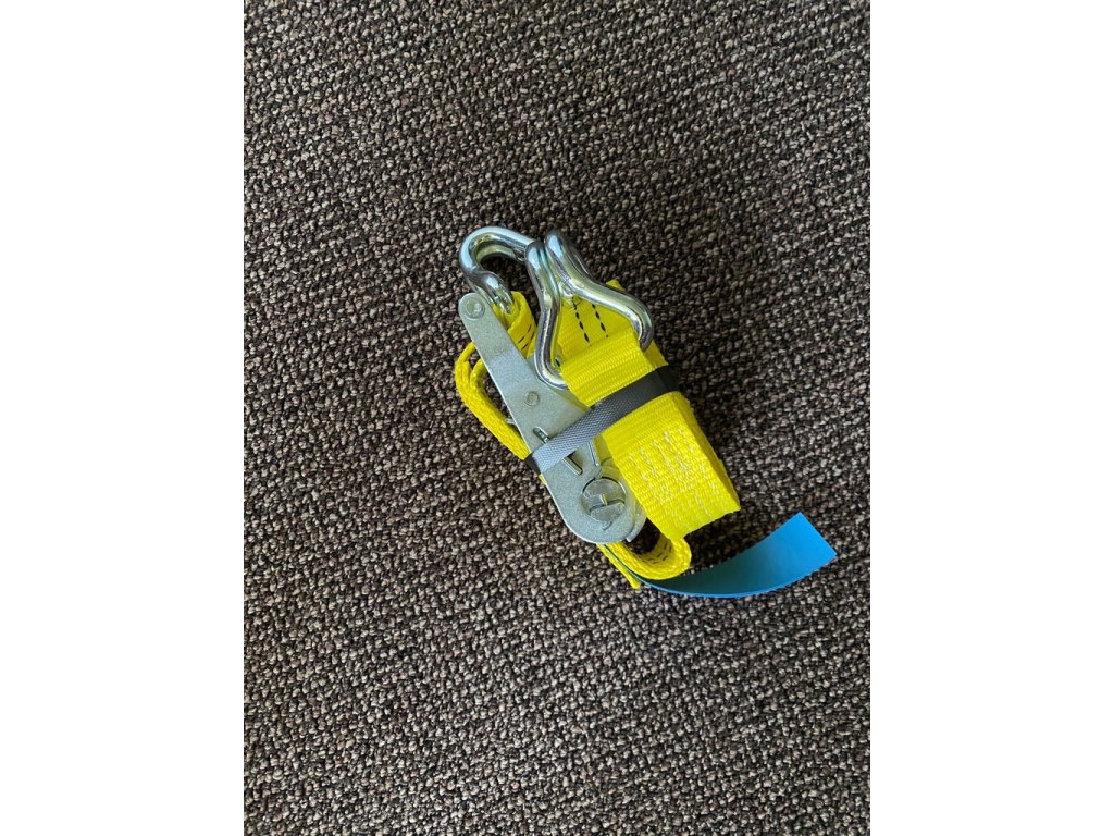 Popruh je vybaven ráčnovým napínákem, který umožňuje rychlé a bezpečné dotažení nákladu bez jeho poškození. Díky pevné konstrukci je vhodný pro každodenní použití při zajištění materiálu na přívěsech, valnících nebo při manipulaci se dřevem.